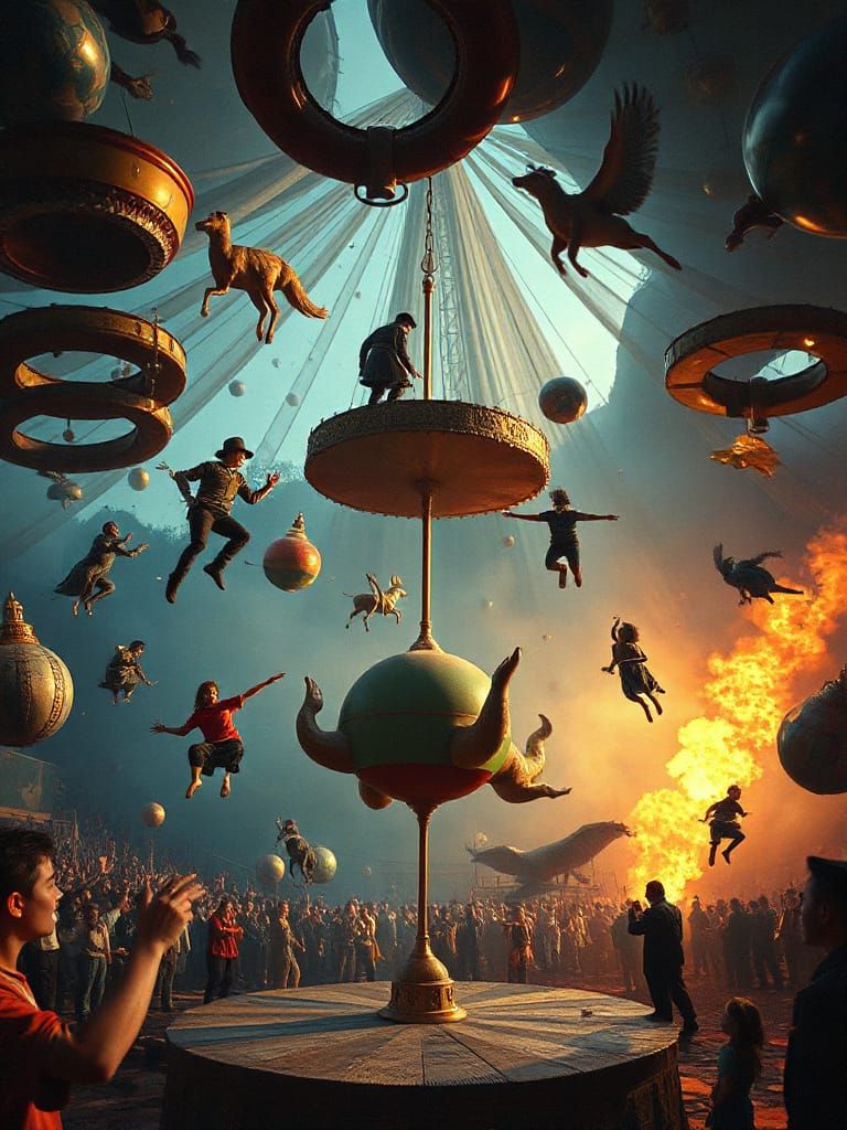 A psychedelic circus scene with floating figures, spinning animals, and warped perspectives. Rendered in painterly realism with vivid colors and dramatic lighting, evoking a surreal fantasy realm.