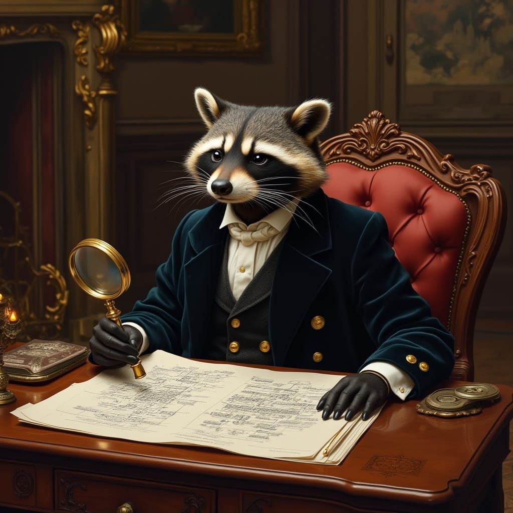 A stately raccoon studies blueprints at a desk. The image evokes a classic oil painting with rich colors and hyperrealistic details, reminiscent of Dutch Masters.