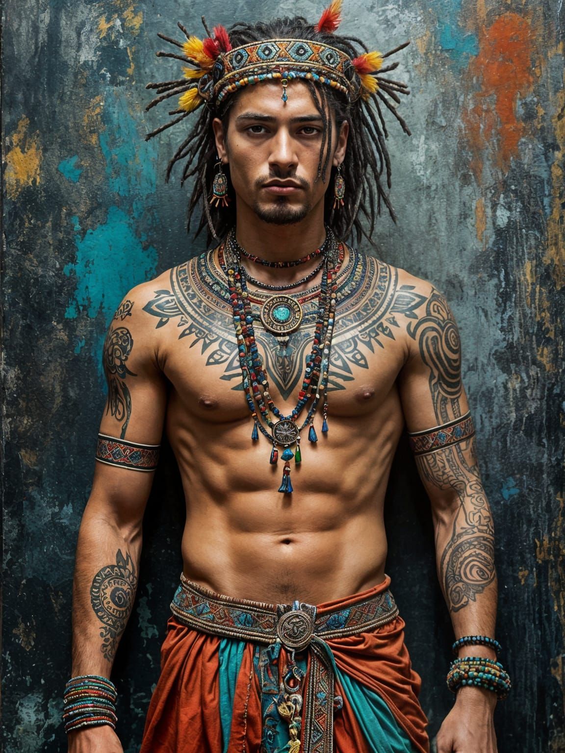 acrylic painting. Toltec-Aztec-Mayan inspired. ¾-view. Male model portrait. multi-layered thick impasto fragments with sfumato-blurred edges.
