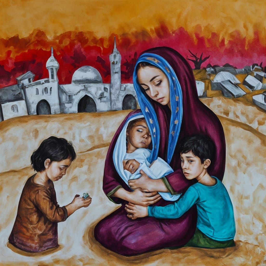 An Arabian woman with two sons and a daughter is holding her baby who has died in her arms of starvation. The scene is tragic and grief and hunger is the main emotion. Around them is a bombed out mess Wadim Kashin folk art