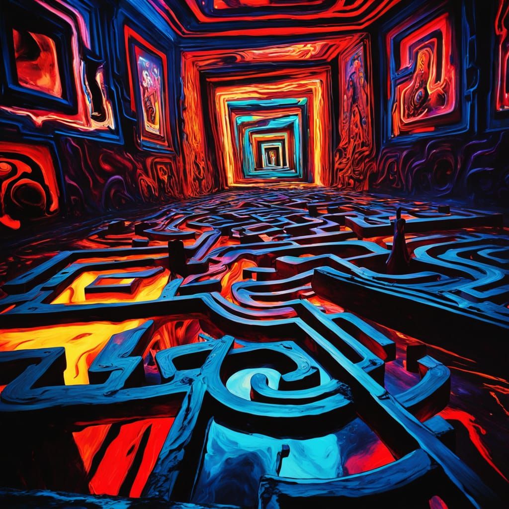 A surreal close-up of a labyrinth in darkness. Twisted corridors and abstract shapes create an eerie, dreamlike quality. This image captures a dark fantasy with vibrant colors and high contrast, reminiscent of surrealist art.