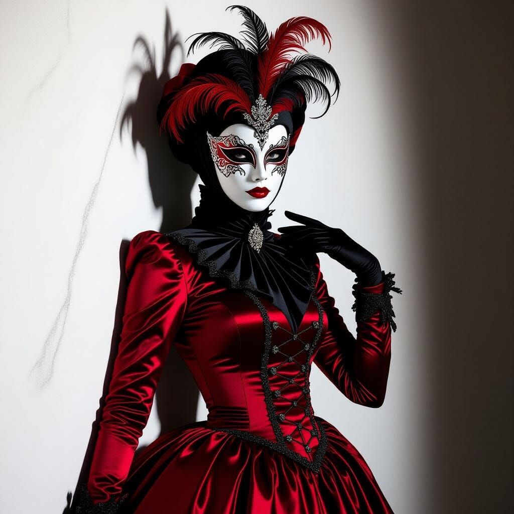 A dramatic figure in a red and black costume poses with an ornate mask. The image features cinematic lighting, strong shadows, glowing highlights, and luxury textures in a high-fashion aesthetic.