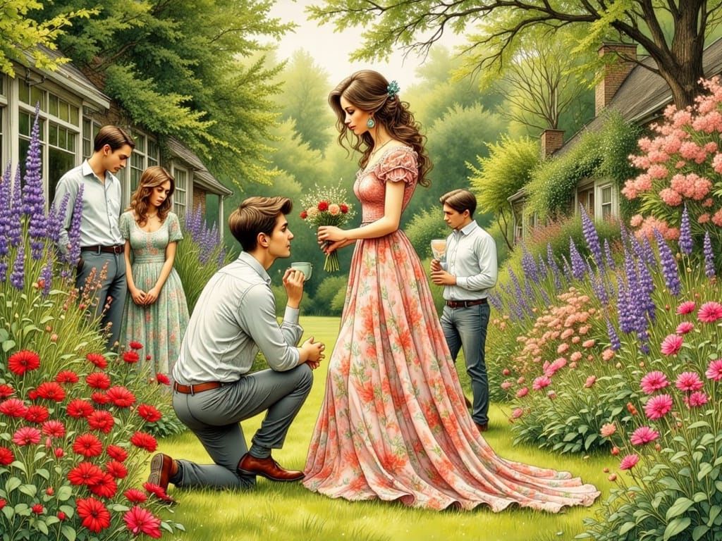 A picturesque backyard proposal scene unfolds with a young woman in a sundress, surprised by her partner kneeling before her. This digital artwork features intricate ink details and an elegant, vibrant style.