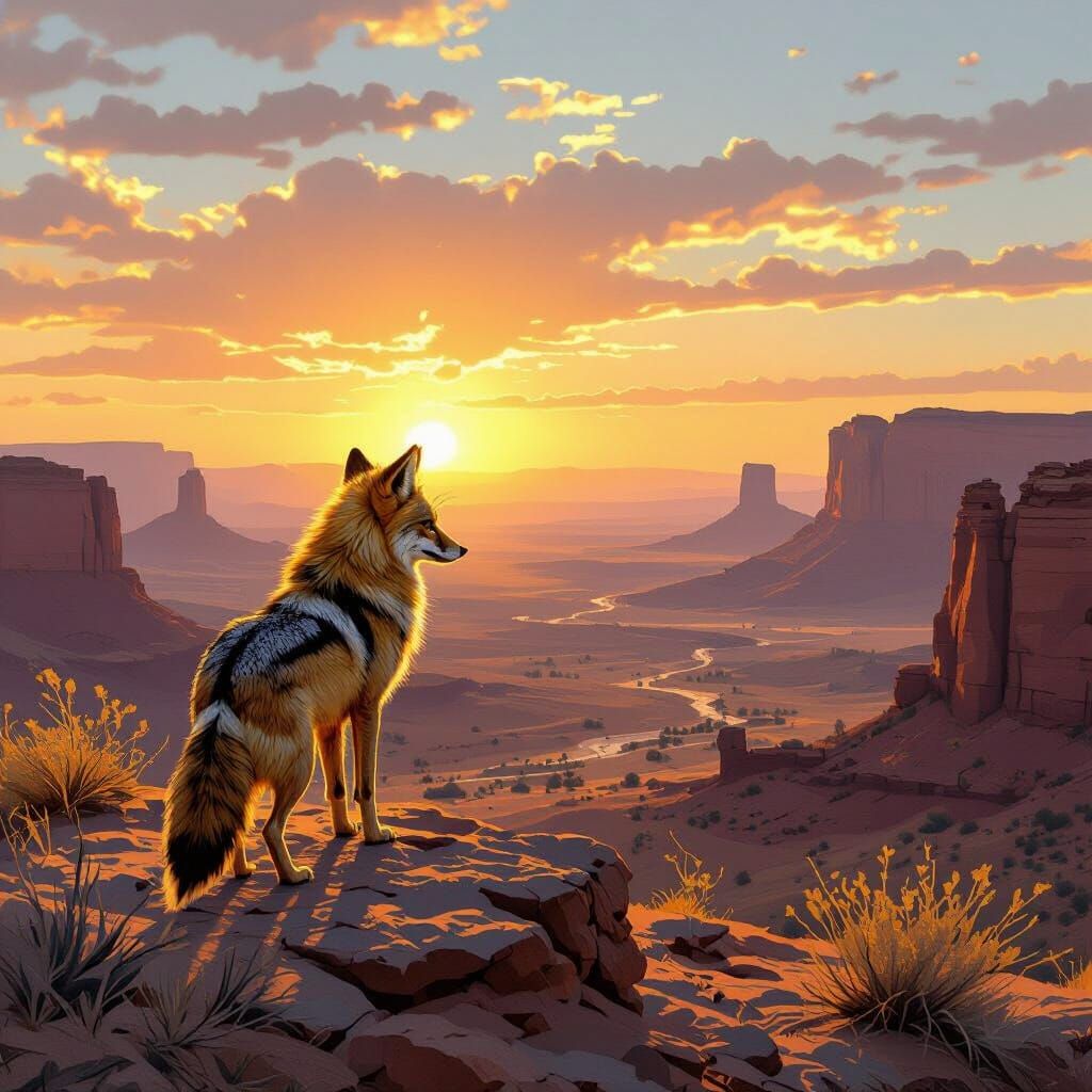 A lone jackal in a coat surveys a desert landscape at sunset. Ancient ruins and rock formations dot the scene, rendered with shimmering light and long shadows in a romanticism art style.