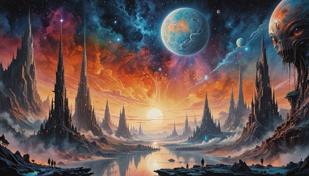 A striking picture of a galaxy dripping into a surreal fantasy world. The image shows alien cities, planets and clouds in a cosmic and abstract style with cool triadic colors.