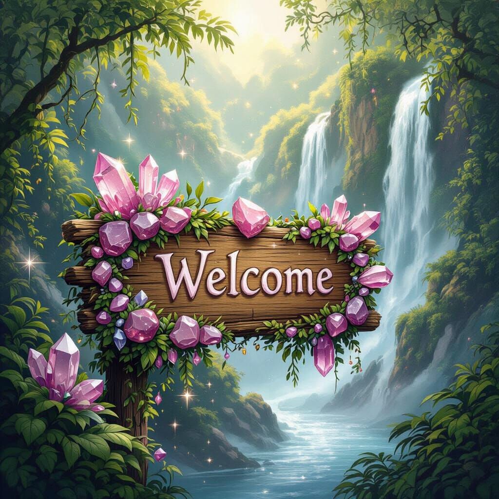 A magical wooden "Welcome" sign, adorned with sparkling pink crystals and lush greenery, marks the entry to a breathtaking, hidden realm. Waterfalls cascade down emerald cliffs, and a sun-dappled river flows through a vibrant, mystical forest. This whimsical piece is perfect for collectors who dream of fairytale worlds and enchanted journeys.