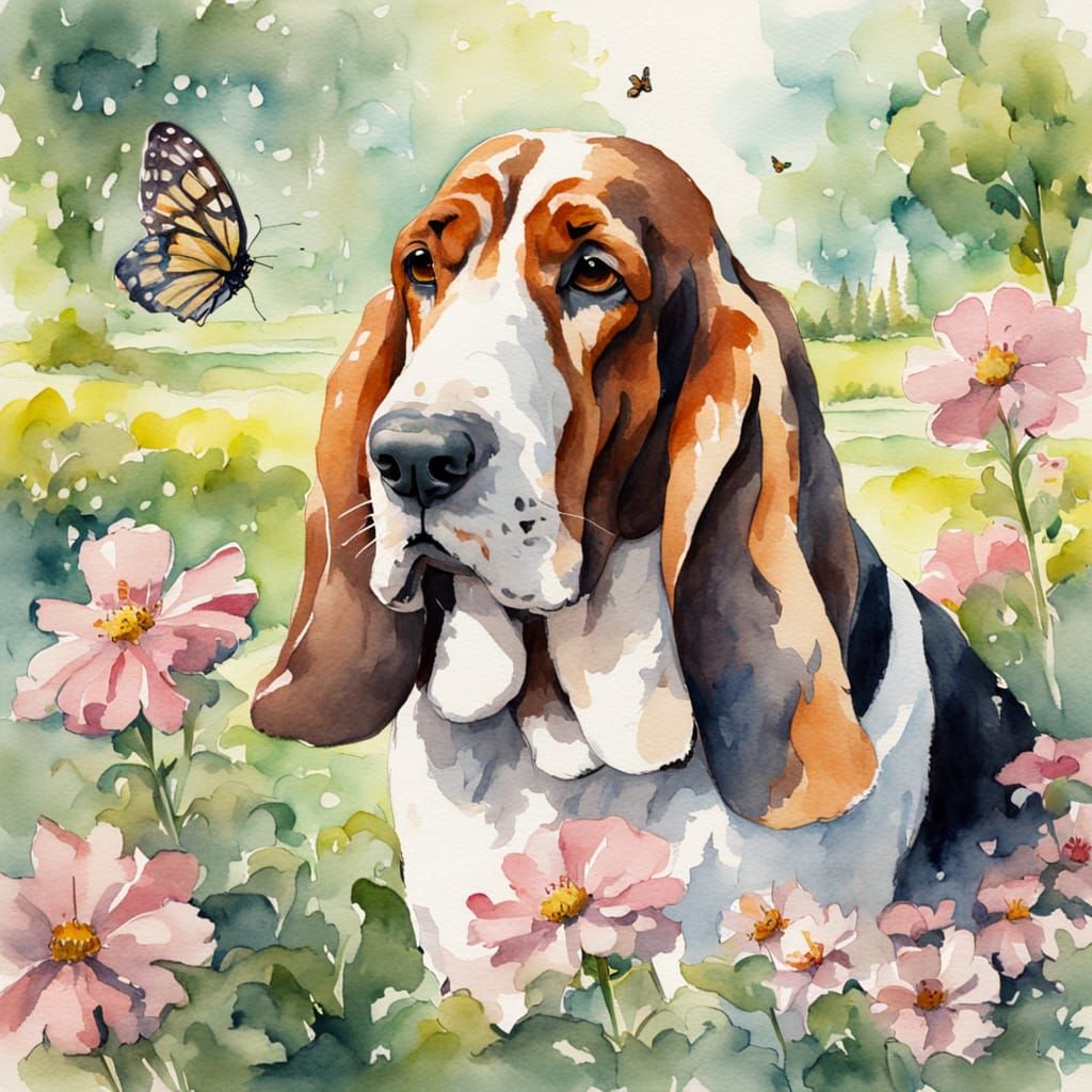 This impressionistic watercolor depicts a Basset Hound joyfully chasing a butterfly in a park. Soft colors and gentle brush strokes create a vibrant, detailed scene.