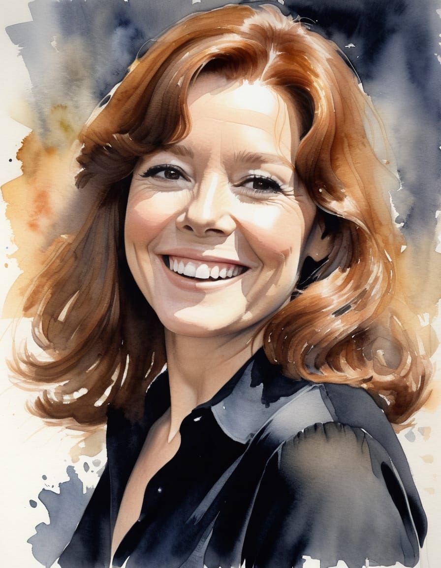 This image shows an impressionistic watercolor portrait of a smiling woman with auburn hair, wearing a black shirt. The artwork evokes a sense of classic beauty.