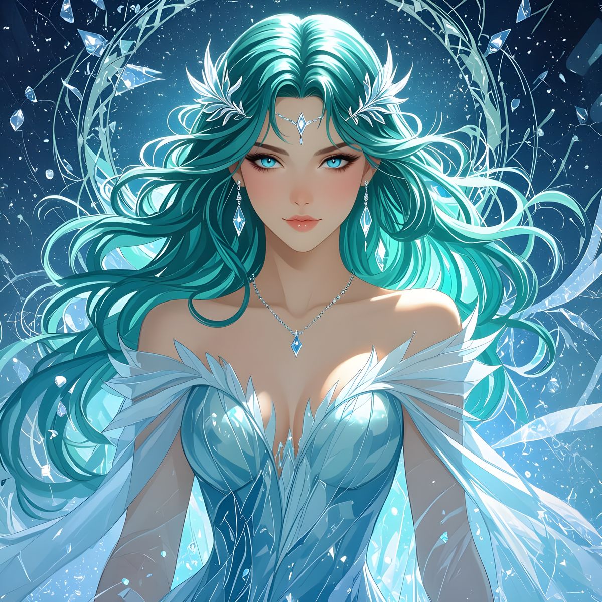 A stunning depiction of an ice nymph with flowing aqua hair and piercing blue eyes. The image, rendered with ethereal light and swirling ice, captures a blend of Art Nouveau elegance and mythological aesthetics.