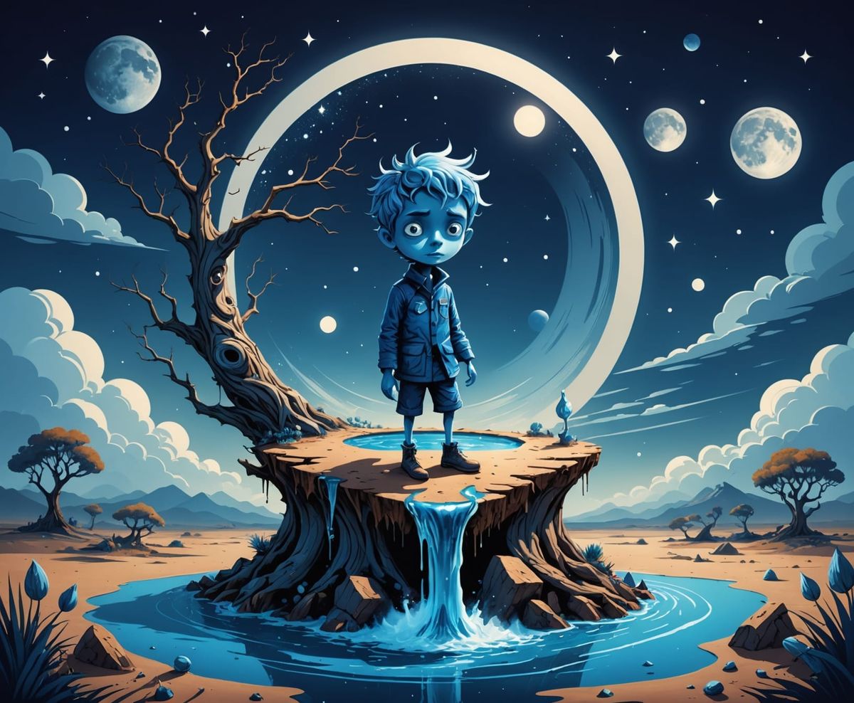 This image shows a surreal weeping willow with blue gradient leaves and a silver trunk. A setting sun and rising crescent moon create a striking contrast, rendered as 3D art with a matte background.