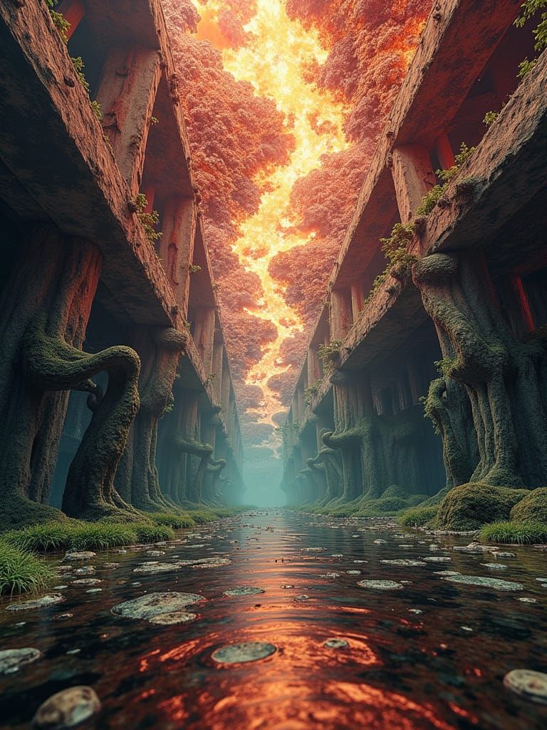 hysterical architectural conceptual digital textile art glitchy-glitchy-coo crazed multiple exposure complex interconnected digitised bio-organic solar systems triaxial ellipsoid hellereal mangrove view distorted kaleidoscopic perspective brings a sense of wonder and unease