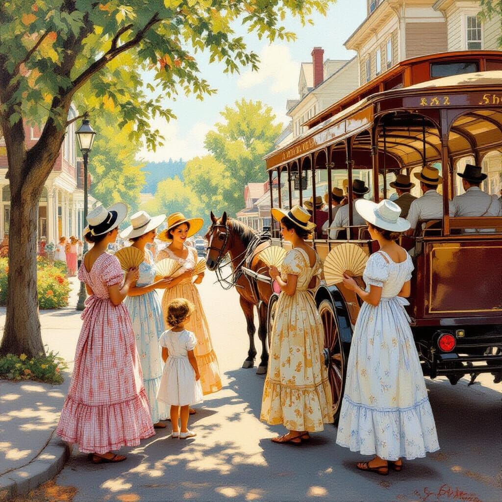 This image shows a group of women and children in late 1800s attire awaiting a horse-drawn trolley on a hot day in Maine. The scene is rendered with warm lighting and intricate details, in a classic American illustration style.