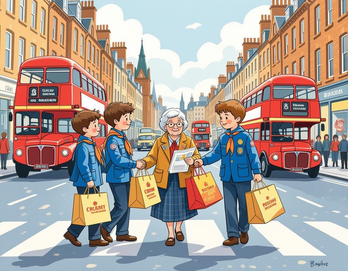 This image depicts three cub scouts assisting an elderly woman with her shopping on a lively Glasgow street. Rendered in a charming, illustrative storybook style with warm colors, it captures a moment of kindness.