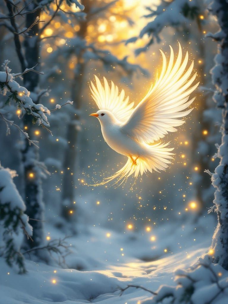 A striking picture of a white bird with translucent wings mid-flight in a snowy forest. Golden sunlight filters through frosty branches in this luminous, magical painting with a fairytale sensibility.
