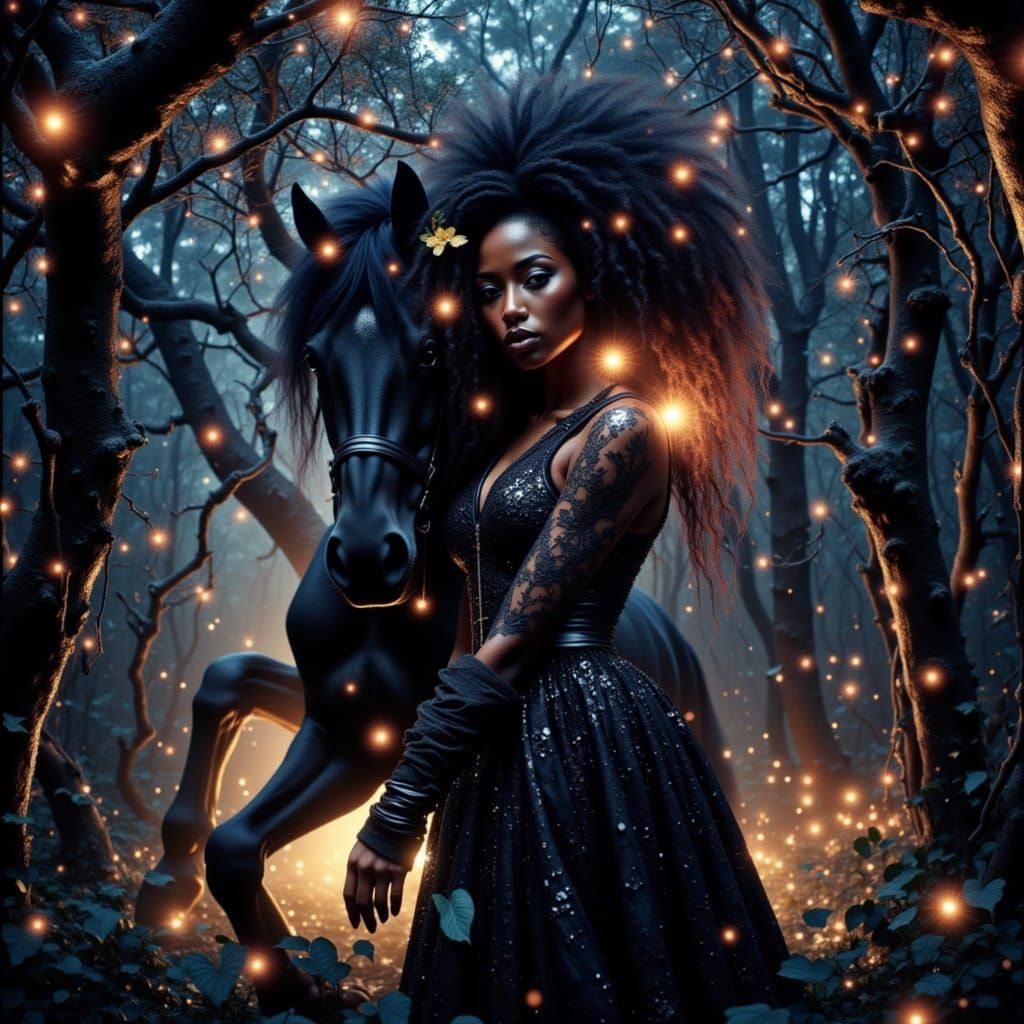 A hyperdetailed, trippy portrait of a young African woman in a black gown, surrounded by a majestic black stallion, fireflies, and the dark, ominous atmosphere of a forest at dusk, all rendered in a Don Macana style with rich, deep colors and intricate details.