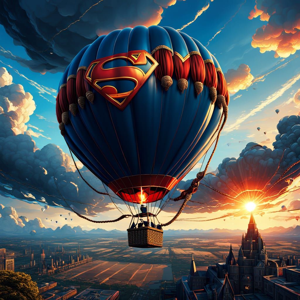 A vibrant image of a Superman-themed hot air balloon soaring through a dramatic cloudy sky. The artwork is reminiscent of comic book art, with intricate details and a cinematic feel.