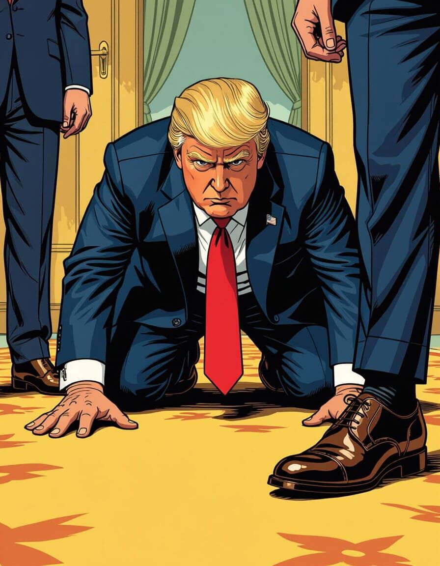 This image depicts a man in a suit crawling near another man's shoes. The artwork is reminiscent of comic book art, utilizing bold lines, vibrant colors, smooth textures, and dynamic poses.