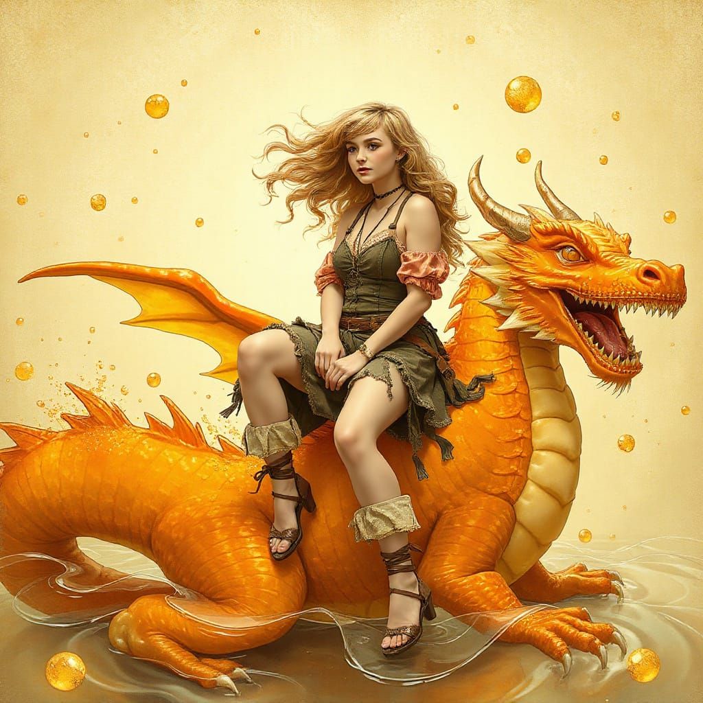 A serene woman with golden hair rides a giant gummy dragon through a bubbly soda sea. The art blends delicate linework with ornate, imaginative, and futuristic styles.