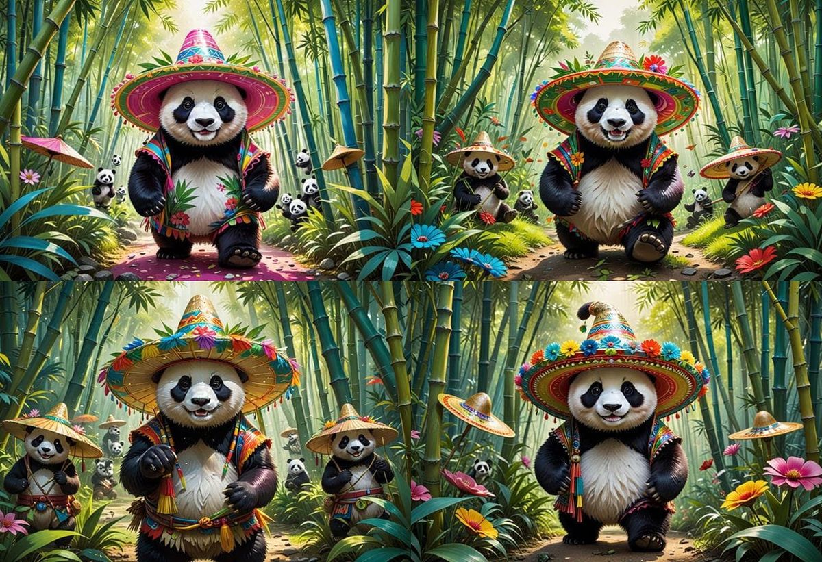 A charming image of a panda wearing a sombrero, surrounded by other pandas in a bamboo forest. The digital painting features bold brushstrokes and bright colors with whimsical details.