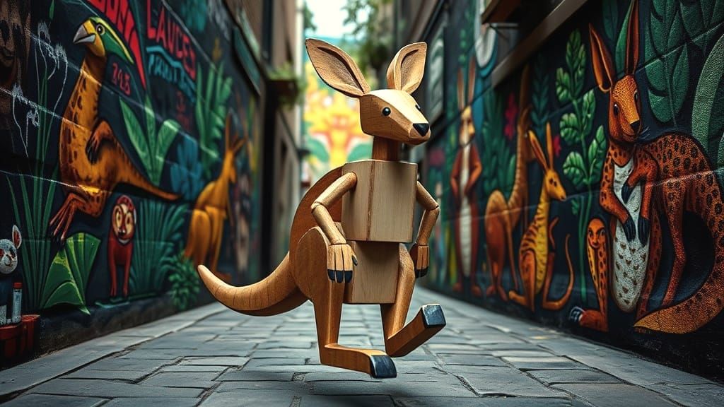 Imagine a cute whimsical wooden kangaroo, whittled out of wood, blocky, not precise, partially painted in muted colors. The kangaroo hops down a deep black cobblestone alley amidst walls with colorful blocky murals, jungle animal murals, and a kangaroo family mural.