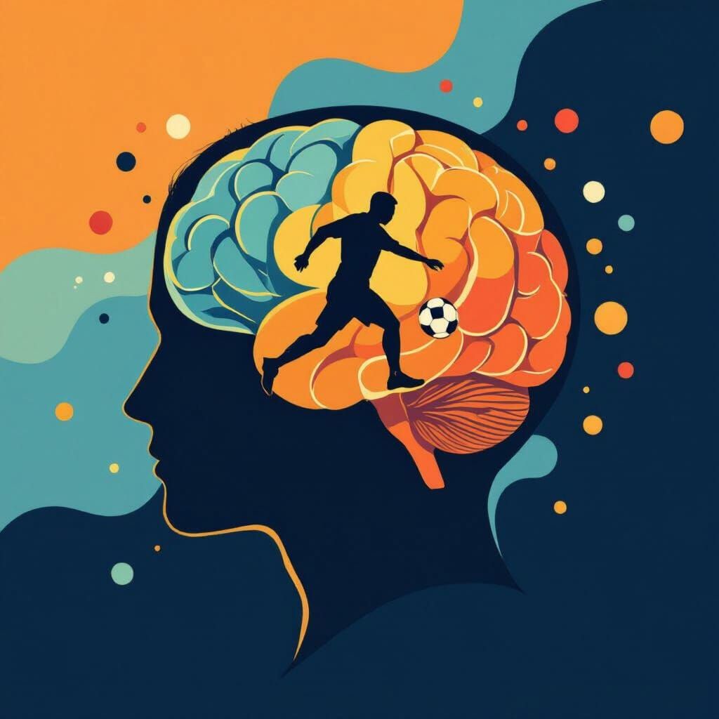 A dynamic, abstract logo design for Akineo, a sports coaching company. The logo features a stylized footballer silhouette within a brain, rendered with fluid curves and simple geometric shapes in blue and orange.