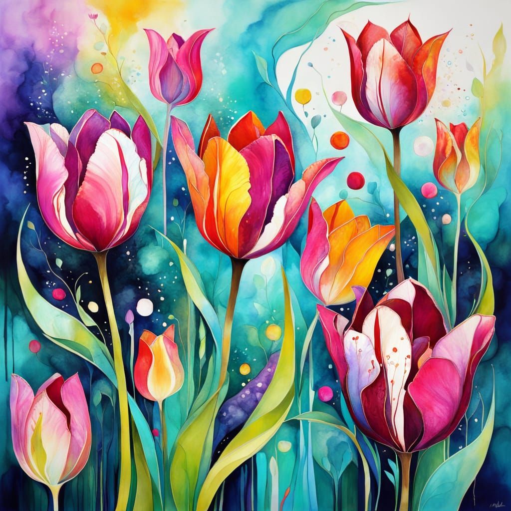 This image shows abstract tulips illustrated with alcohol ink in magical triadic colors. The arabesque design evokes a sense of fluidity in a surreal style.