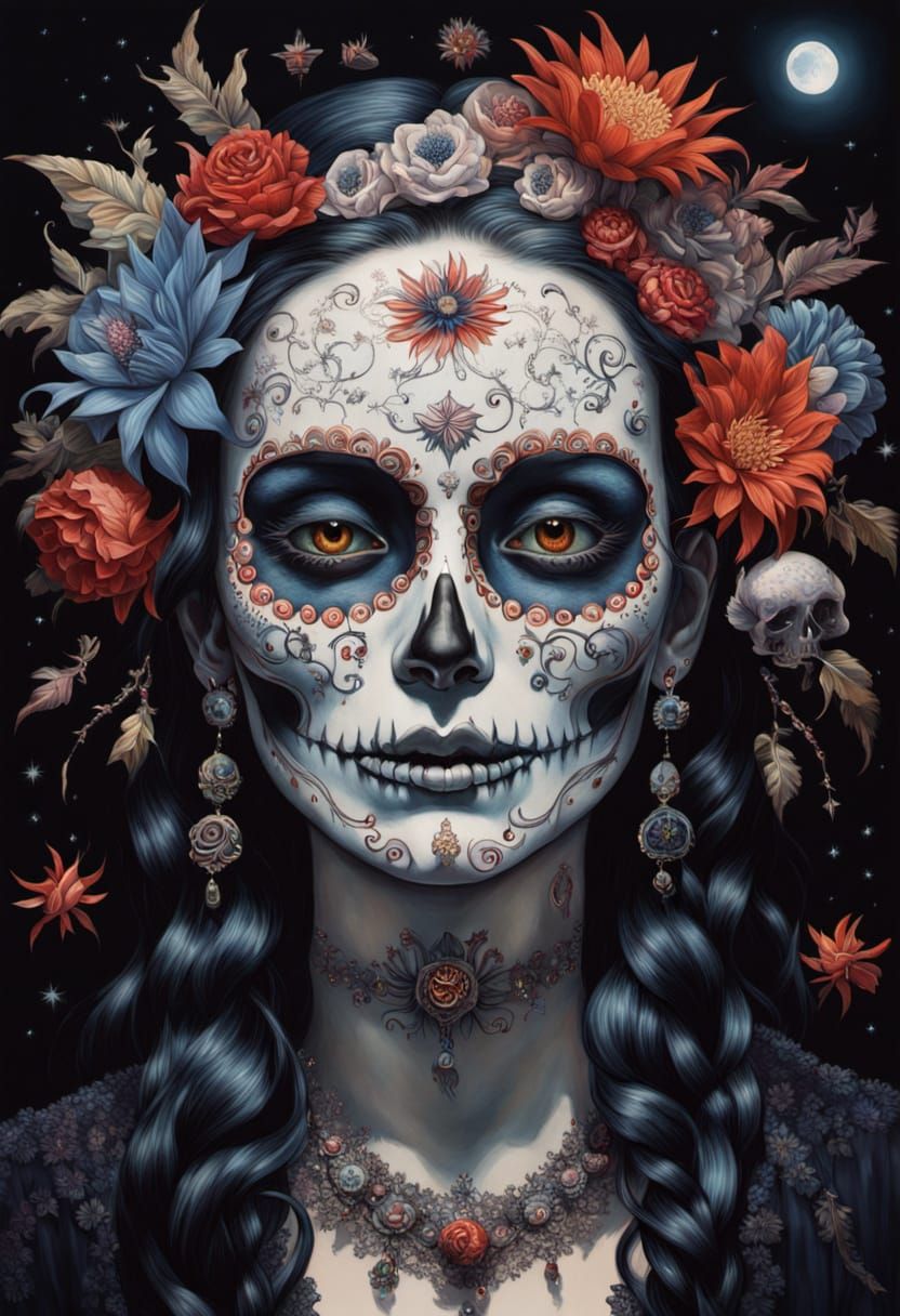 Generate your own unique Catrina skull images with floral tattoos and jewelry. It's free and easy to get started!