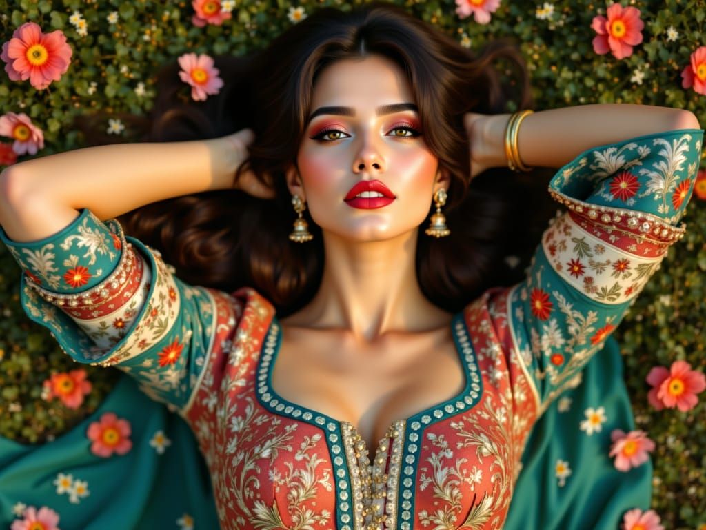 A striking portrait of a beautiful woman in traditional Pakistani dress lying in a field of colorful flowers. The image features hyperrealistic detail and vibrant colors.