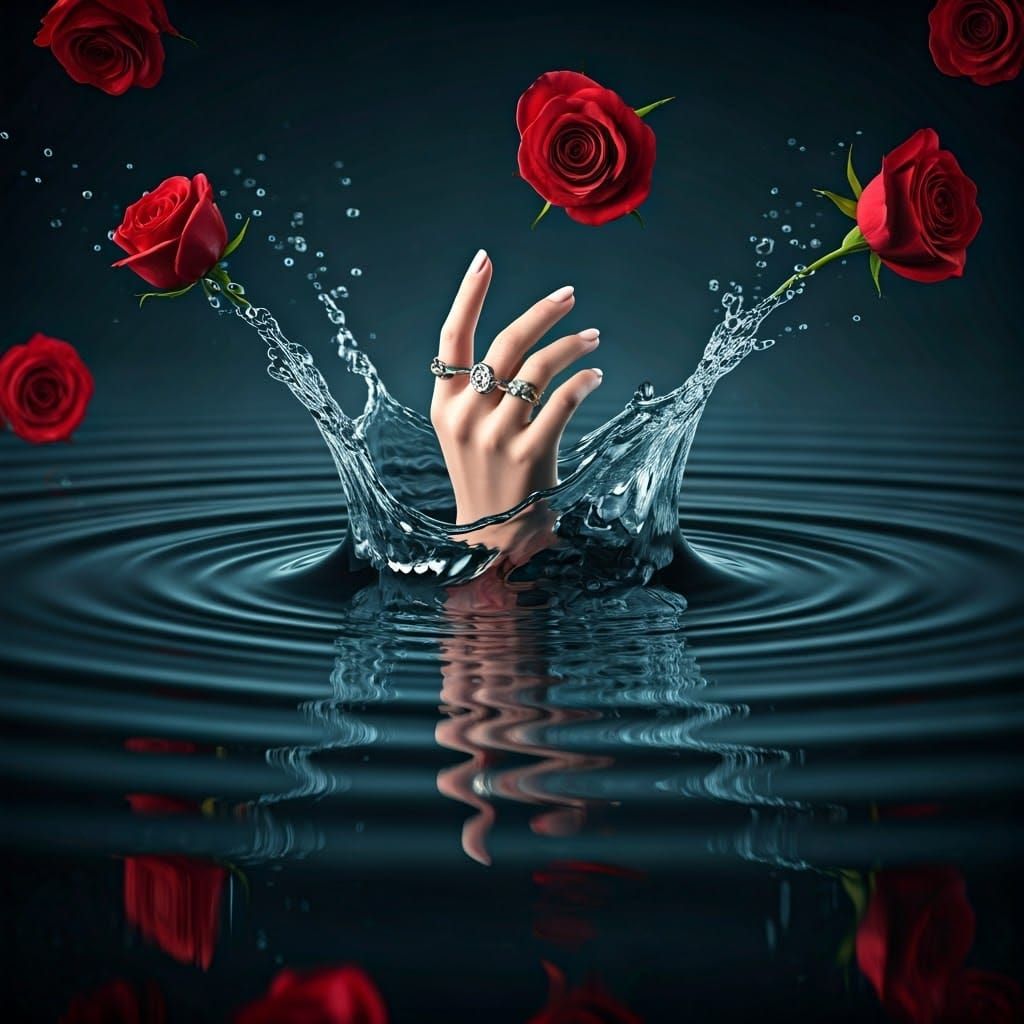 A striking picture of a woman's hand emerging from water. Red roses float around the hand in a surrealist style reminiscent of digital art. The hand is adorned with bejeweled rings.