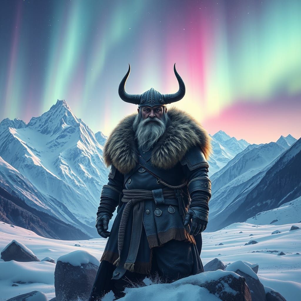 This image shows a powerful Viking warrior standing strong amidst snow-capped mountains, surrounded by a vibrant winter aurora in a dreamy, ethereal style with bold brushstrokes.