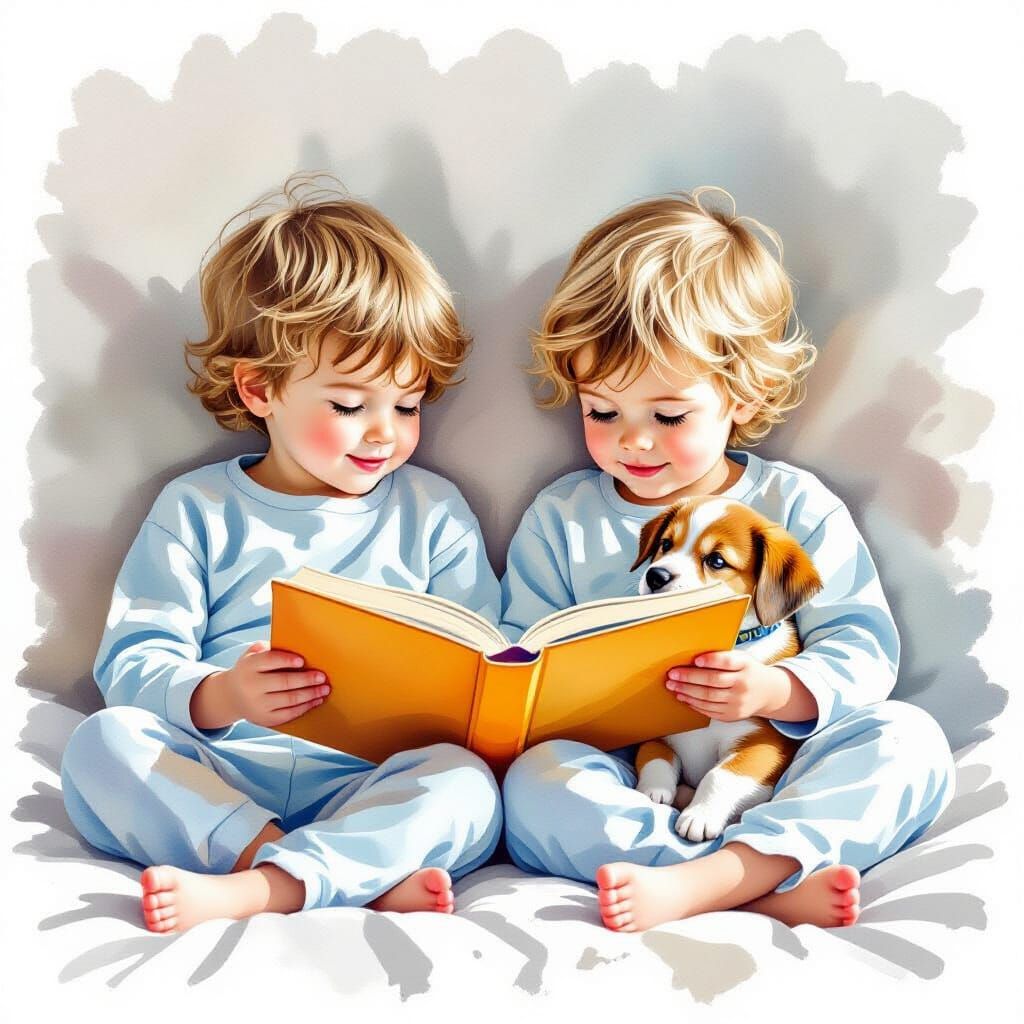 This image depicts two children in pajamas reading a book with their puppy, rendered in a lifelike watercolor style.