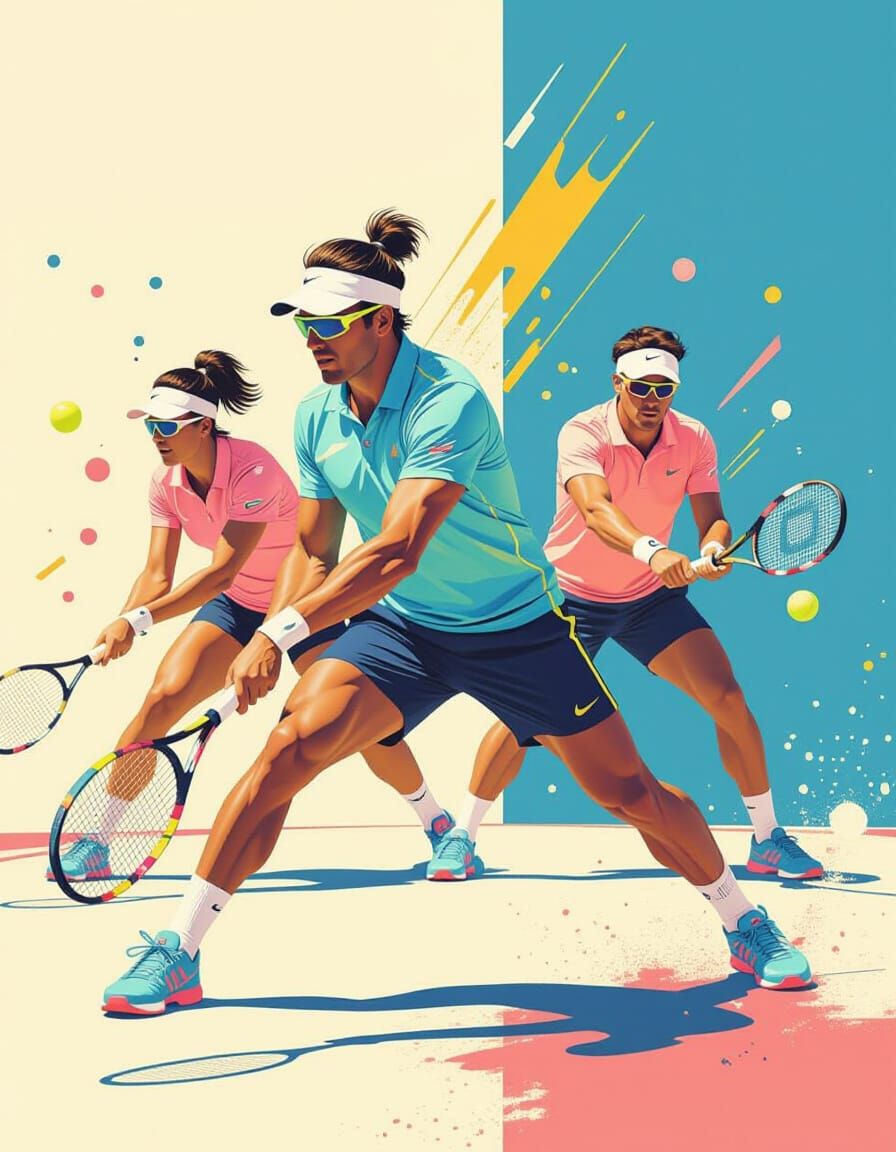 Energy bursts, explodes, and ricochets off every saturated hue in this vibrant composition. The bodies are sculpted mid-motion, taut with the moment’s impact, caught in an intensity that borders on dance. Blue, pink, and yellow clash and respond like chromatic racket strokes across a mental court. The lines, sharp and fluid, trace a choreography of perfect gestures. There is no shadow here — only light, rhythm, pulse. You can feel the sweat, the sun, the momentum. Each player becomes the embodiment of drive, play, and joyful competition. This piece doesn’t narrate a match, but the very essence of sport: transcendence, fluidity, brilliance. It is a graphic explosion — a pop homage to the muscular elegance of tennis.