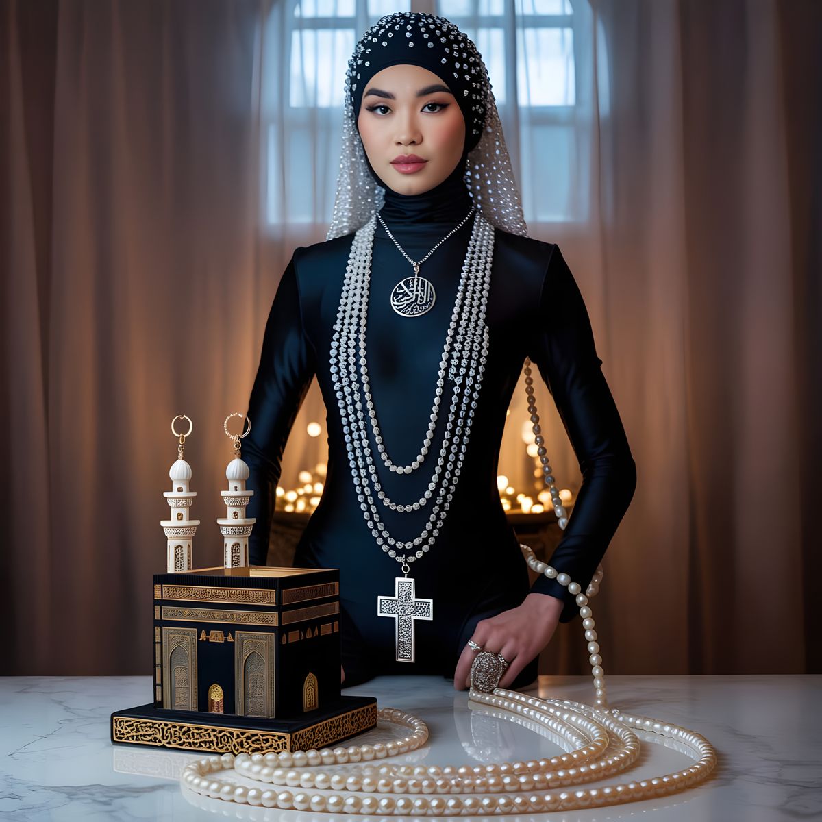This image shows an Asian woman in a dark catsuit and pearl niqab, accessorized with a pearl body chain and necklaces featuring religious symbols, standing before a detailed Ka'bah replica. The portrait is softly lit to enhance the jewelry's opulence.