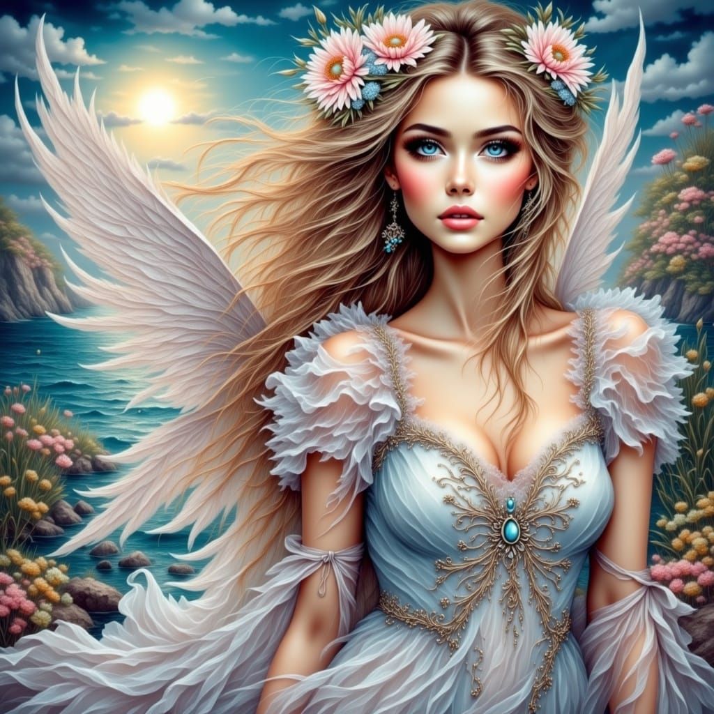 A whimsical fairy stands near a windy ocean in this image. The artwork evokes an antique watercolor aesthetic, with soft washes of color and delicate details.