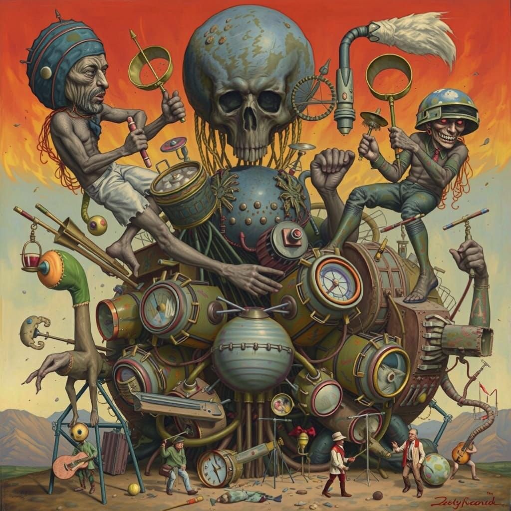 This image depicts a detailed and surreal scene of a subversive group, rendered with sharp focus and intricate detail in a style reminiscent of surrealist and mechanical art.