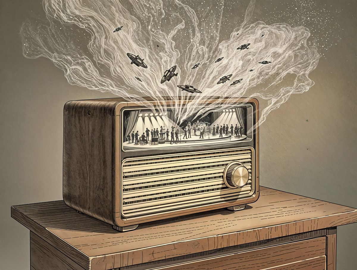 A detailed illustration of a 1940s vintage radio emitting a miniature, dynamic scene of a ghostly big band or retro spaceships, creating a nostalgic and uncanny atmosphere.