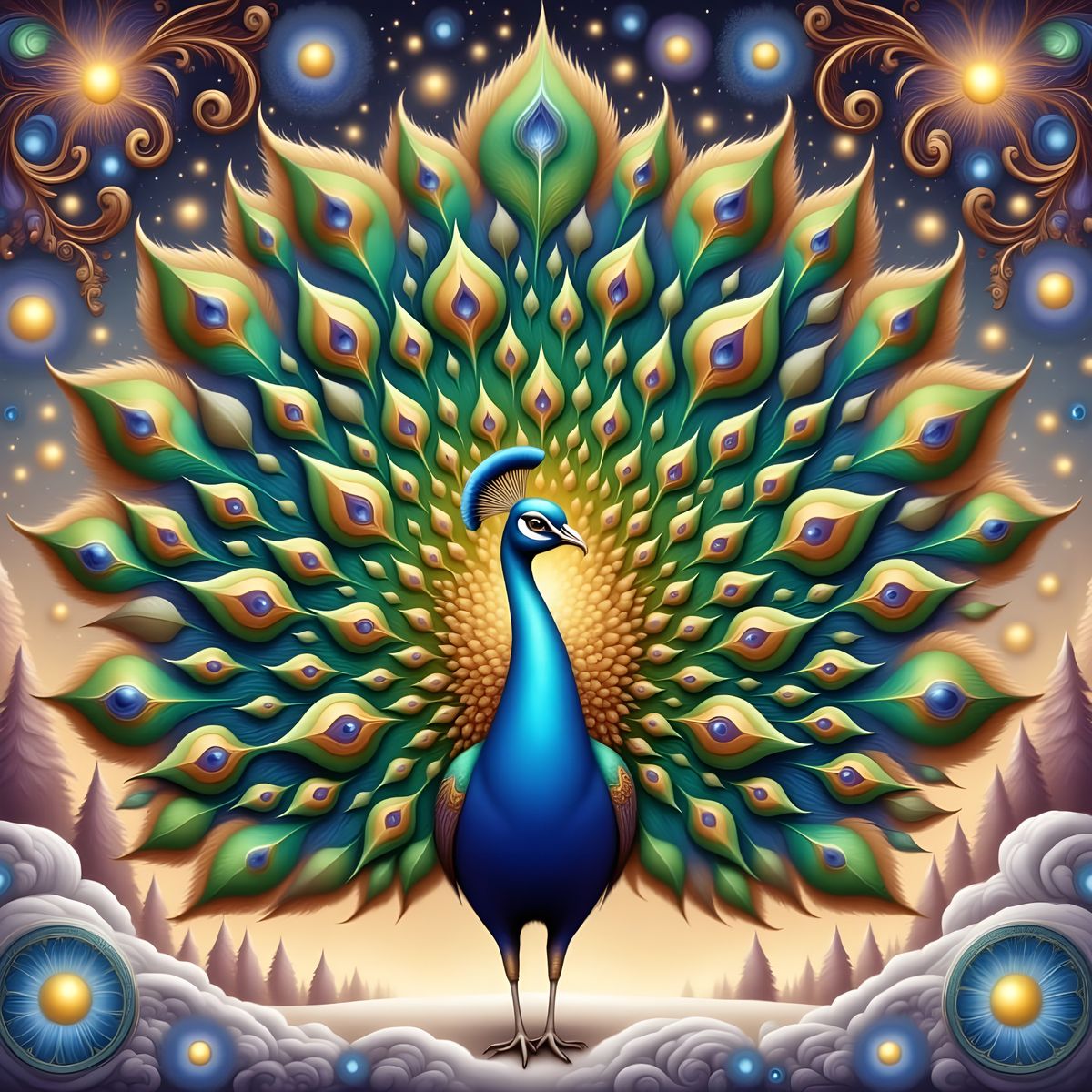 This image showcases a majestic peacock with iridescent tail feathers adorned in intricate paisley patterns. Rendered in a whimsical storybook style with ethereal lighting, it creates a magical, ornate digital art piece.