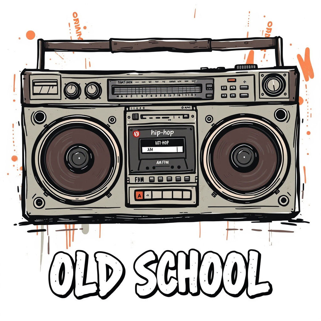A striking picture of a vintage boombox. This hand-drawn retro illustration features a distressed, grunge aesthetic evoking 1980s hip-hop culture in a bold, eye-catching color palette.