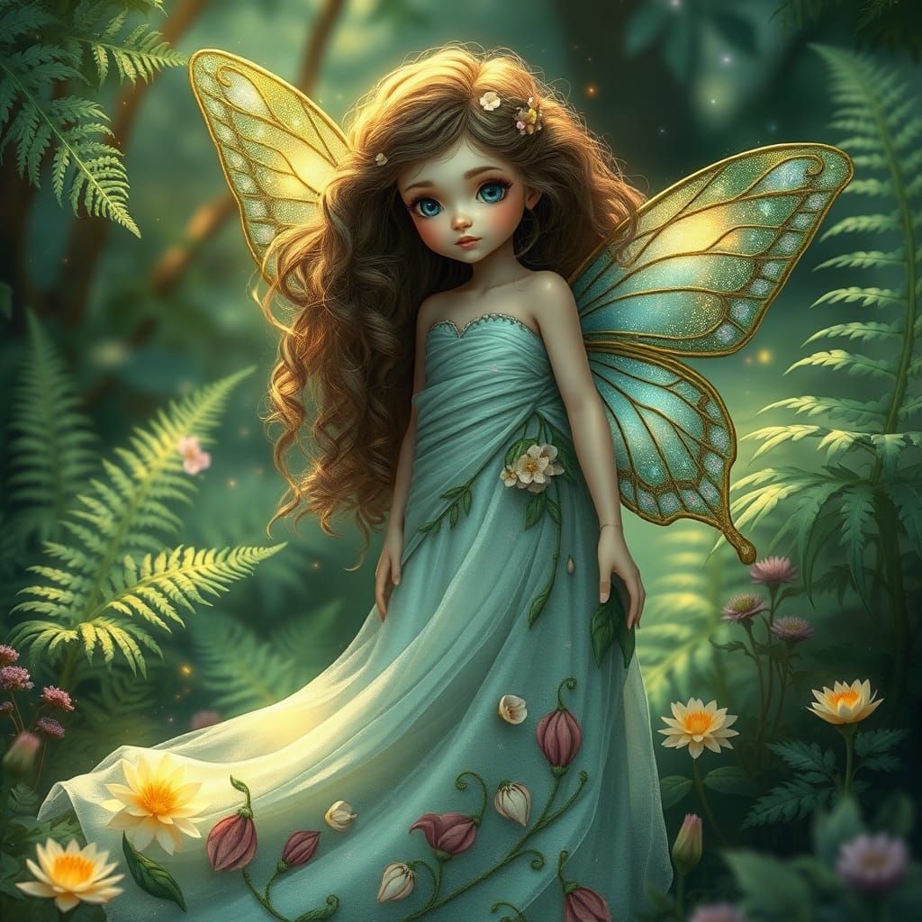 A magical girl with butterfly wings stands in a luminous forest filled with wildflowers. She wears a flowing dress with floral embroidery and has long, curly hair. The image has an ethereal, dreamy quality.