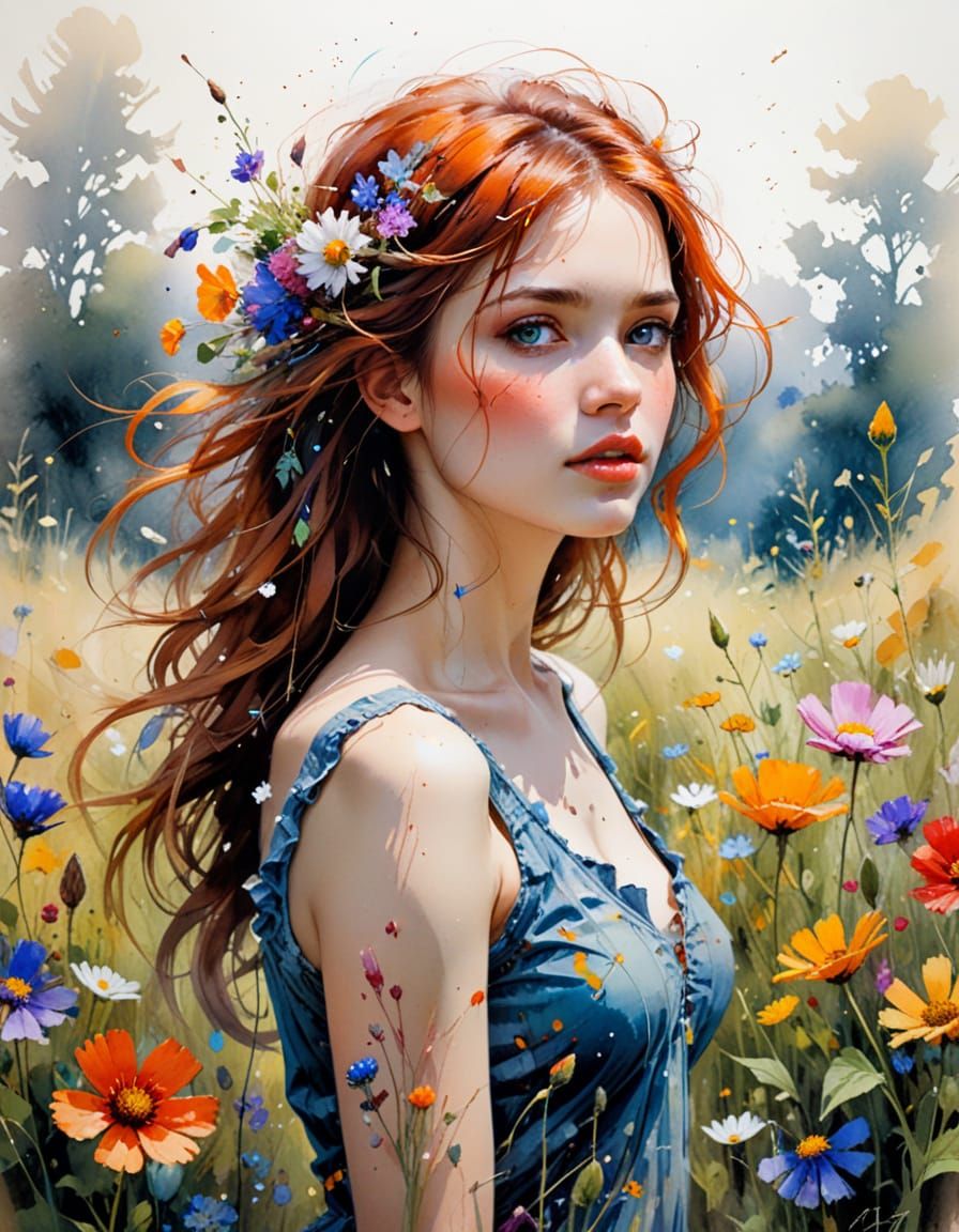This vibrant watercolor painting captures a carefree girl surrounded by wildflowers in a sun-drenched meadow. Characterized by loose brushstrokes, delicate washes, and intricate details, the piece exudes a whimsical atmosphere with soft light and gentle shadows.