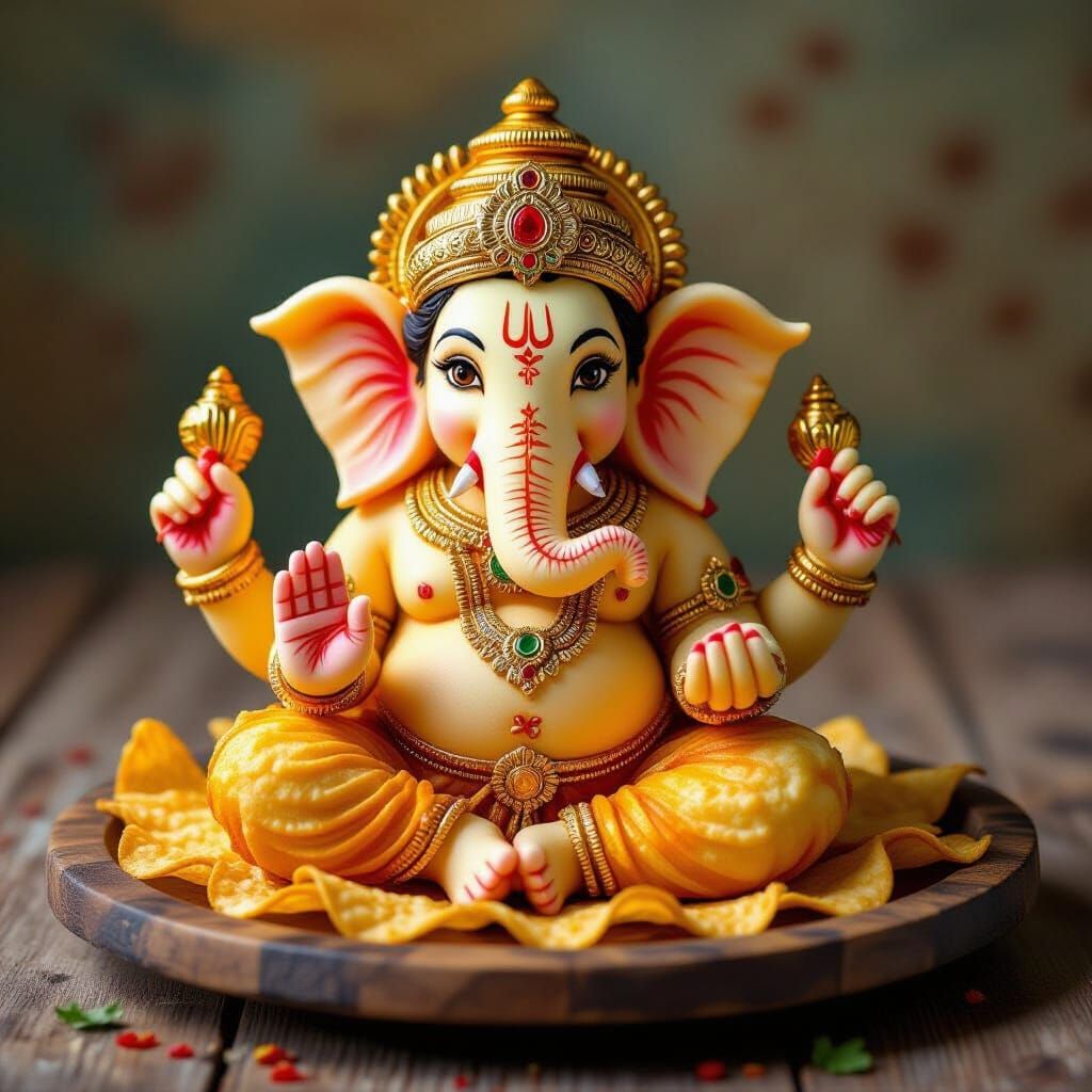 This image shows Lord Ganesha meticulously constructed from potato and vegetable chips. The deity sits on a wooden platter, seasoned with chili flakes and herbs, rendered with realistic textures and vibrant colors.