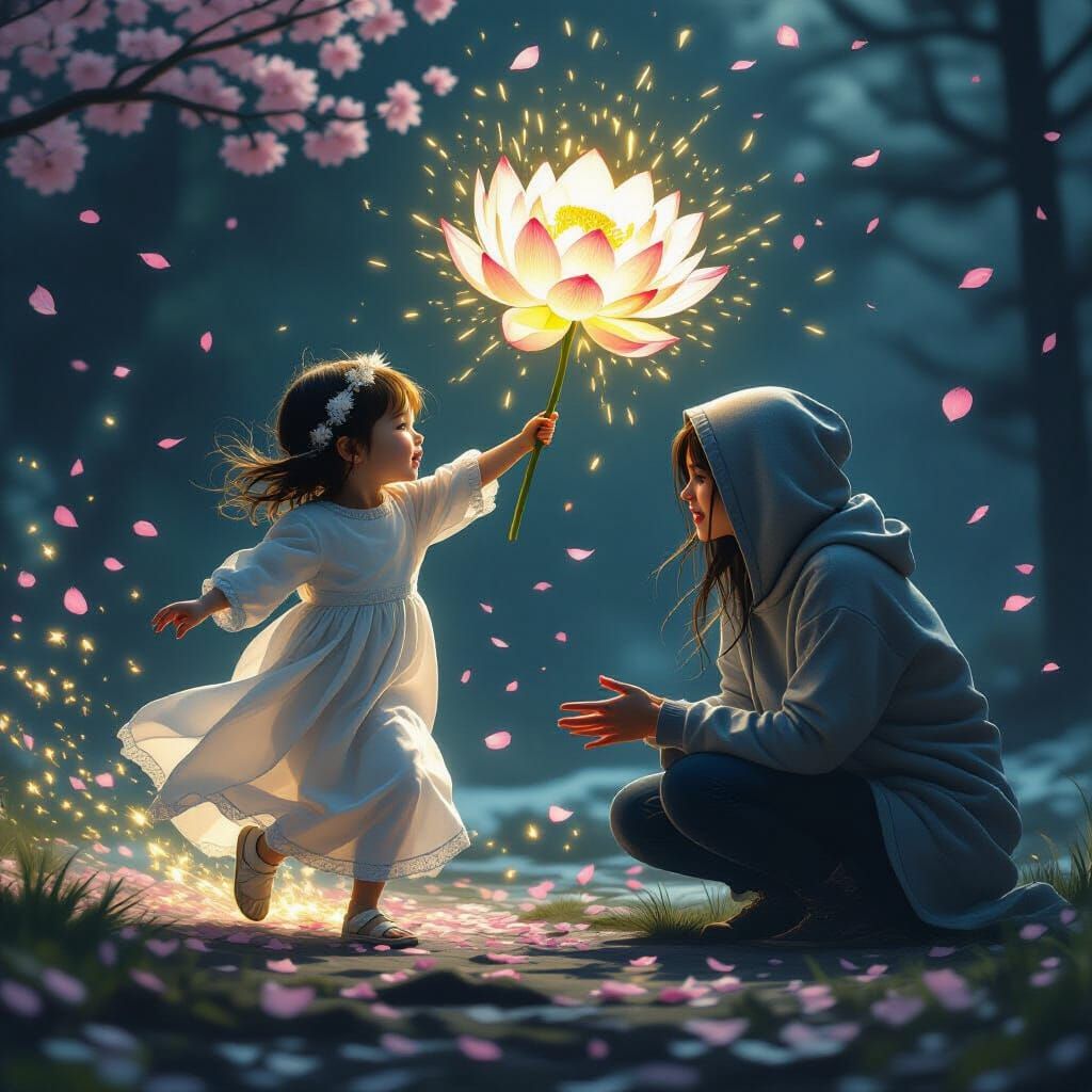 This image shows a bioluminescent toddler radiating light as she runs toward her mother in a ruined room. The scene is lit by the child, in a digital art style.