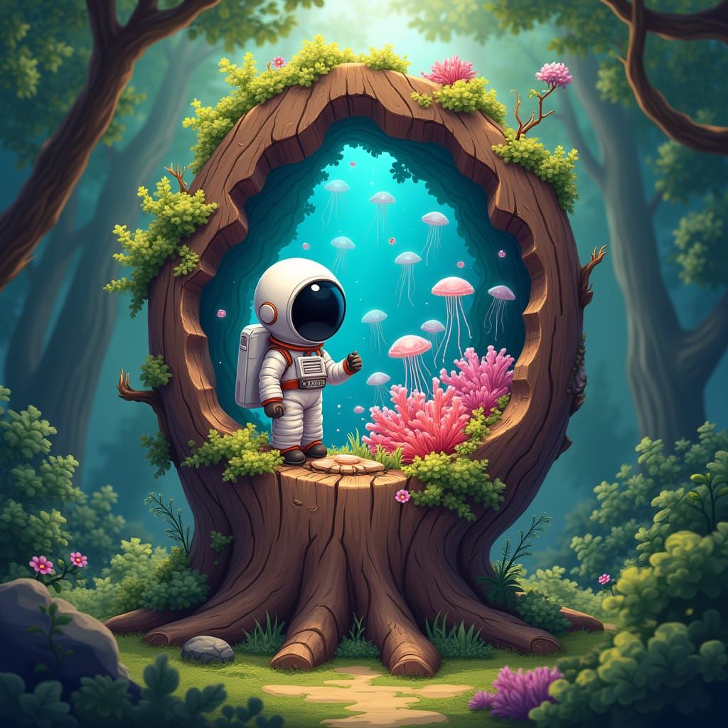 Ornate wooden sculpture. A chibi astronaut explores a vibrant coral reef teeming with bioluminescent jellyfish carved out of a old tree stump. Background lush forest and moss covered clearing. Sunlight streams through canopy. Flat, Manga Scan, Anime, cinematic lighting, drawn Art, by Studio Trigger, ...