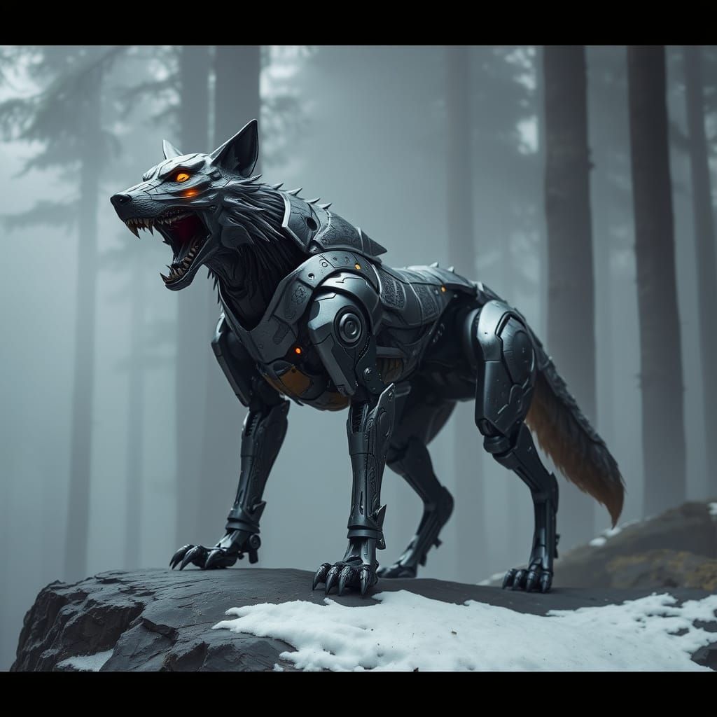 A dramatic image of a robotic wolf standing on a rocky outcrop, surrounded by fog-shrouded trees and snow-covered ground, with intricate metallic patterns and glowing orange eyes.