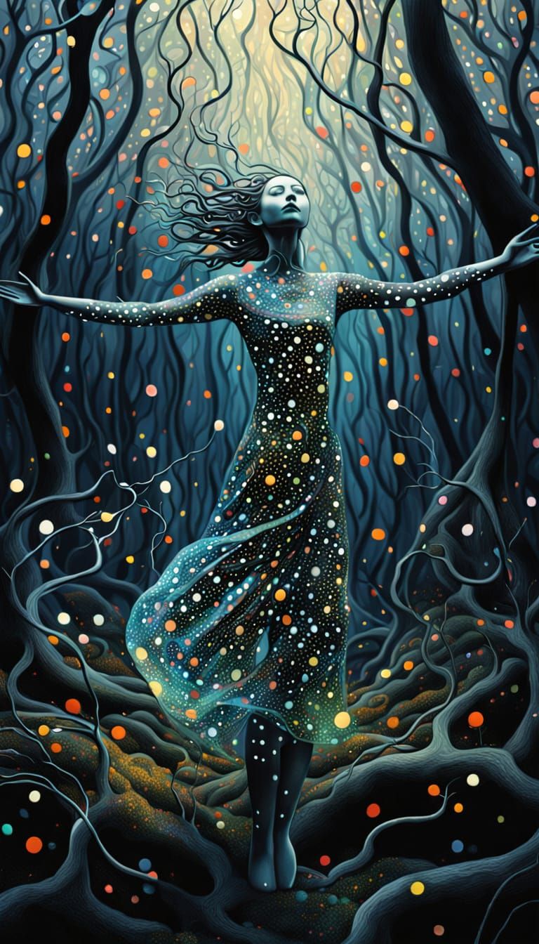 This enchanting, surreal bio art sculpture depicts an iridescent woman rising from the dark forest floor, her branches stretching towards the sky like trees. Intricate patterns and abstract designs dance across her body, surrounded by gentle, ethereal light and vibrant colors.