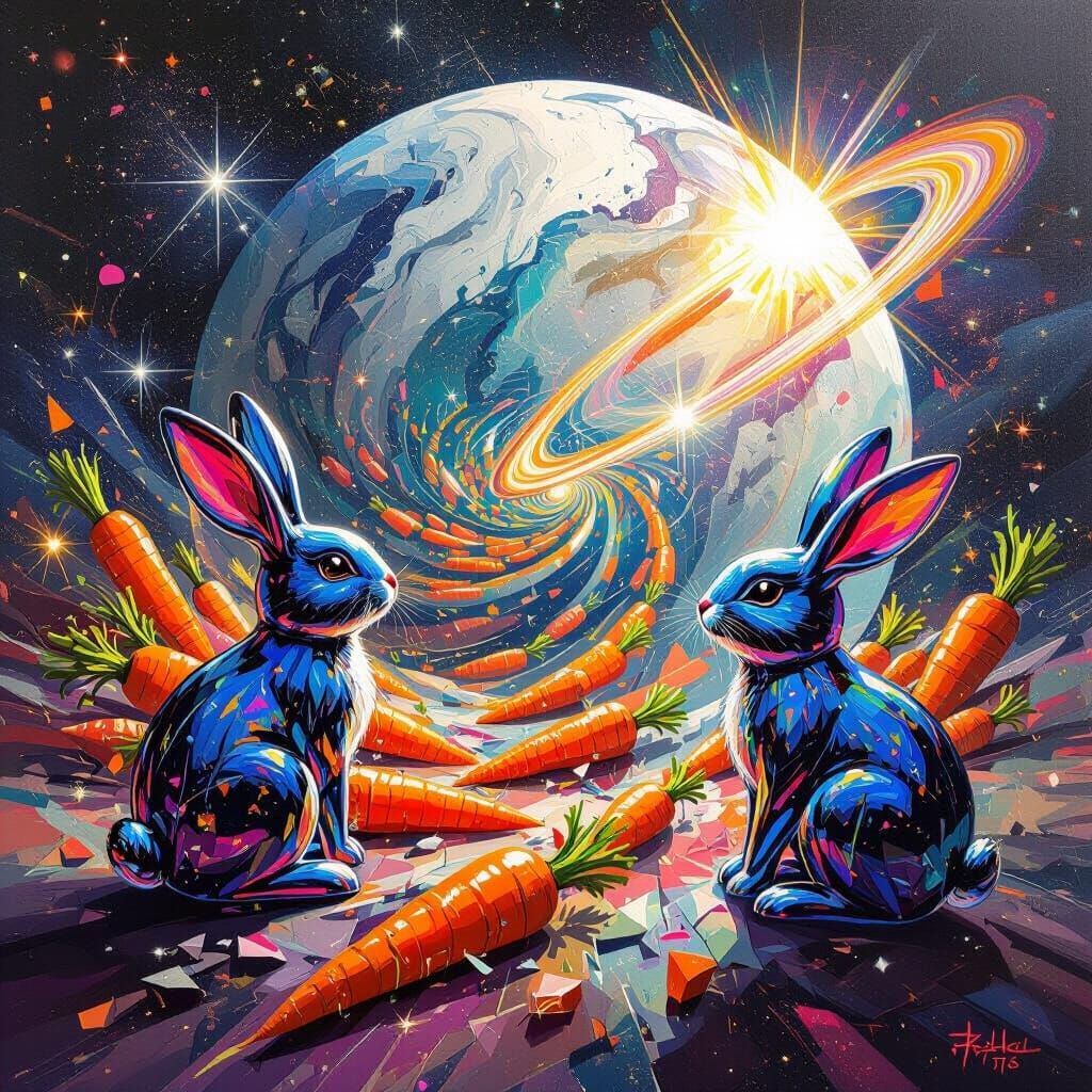A vibrant kaleidoscope image filled with glass bunnies and carrots spiraling toward a marble planet. Graffiti, splash, and street art styles combine with bold, high-contrast colors in this polychromatic rendering.