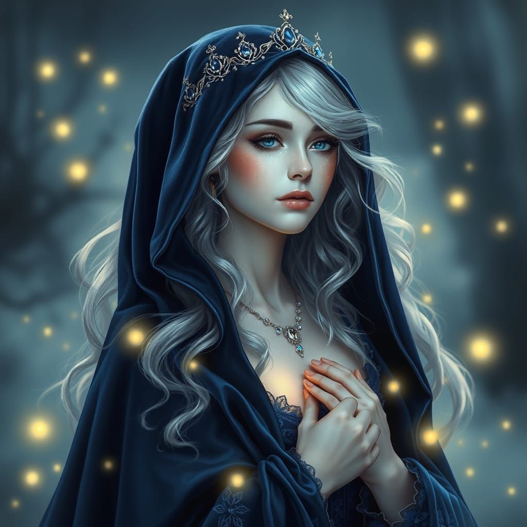 A Pre-Raphaelite style portrait of a woman in a blue cloak. The dreamy image shows her iridescent skin and silver hair illuminated by fireflies in a misty garden.
