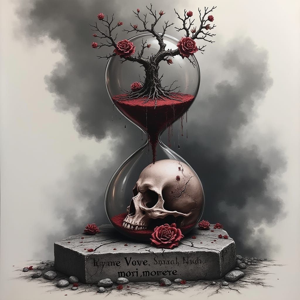 This haunting image depicts a shattered hourglass with a withered tree and thorny roses, set against a backdrop of smoke and ash, illuminated by a dramatic, eerie light. The bold, expressive lines and muted grayscale color palette evoke a sense of foreboding and mystery, reminiscent of Baroque and surrea...