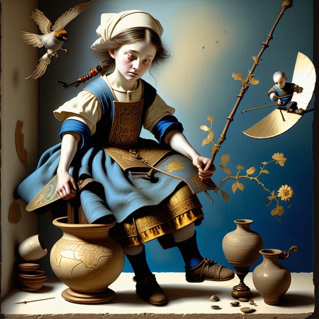 A Renaissance painting depicts a person with extra limbs standing amidst broken pottery. Golden light illuminates the scene with kintsugi details, showcasing vibrant yellow and blue colors in high contrast.