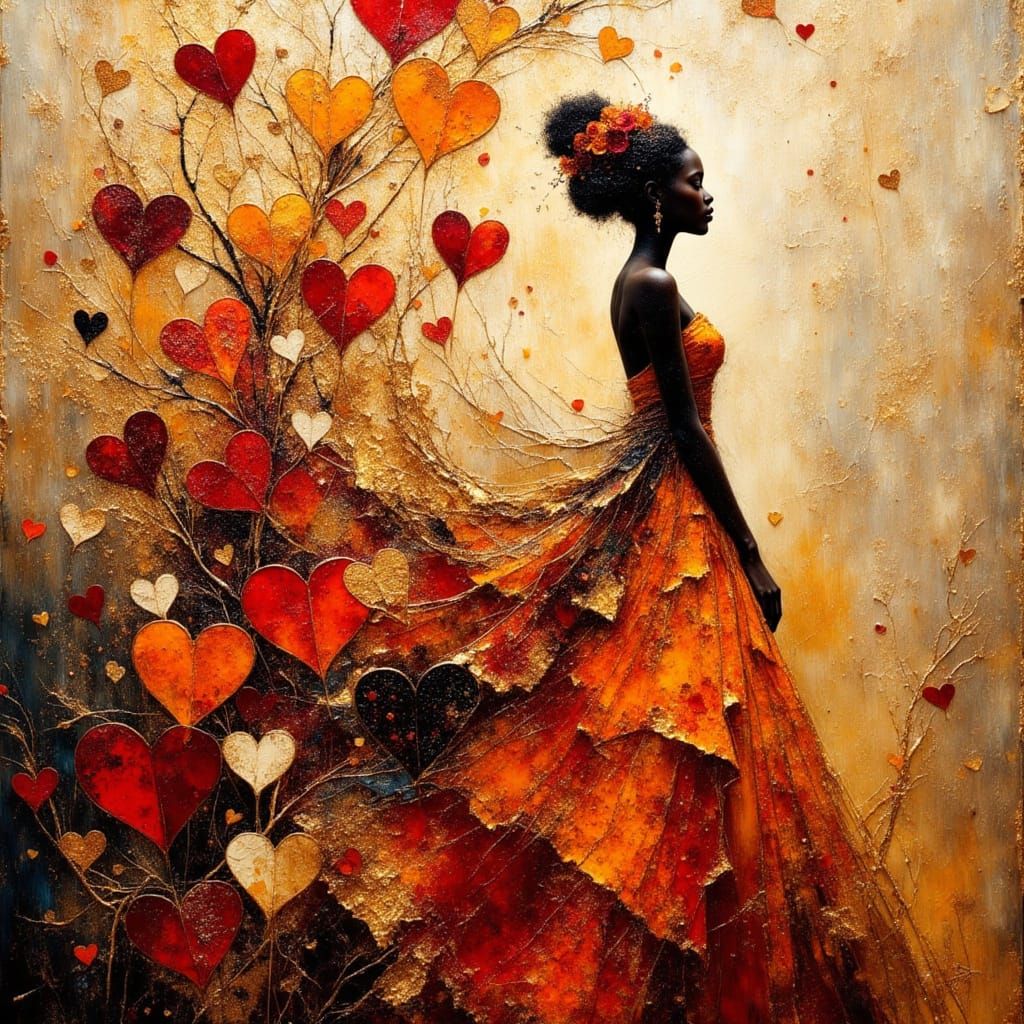 A striking picture of an African princess silhouette. Her dress blends into hearts, rendered with encaustic, impasto, gold leaf, and a rich palette to create a textured and luxurious vision.